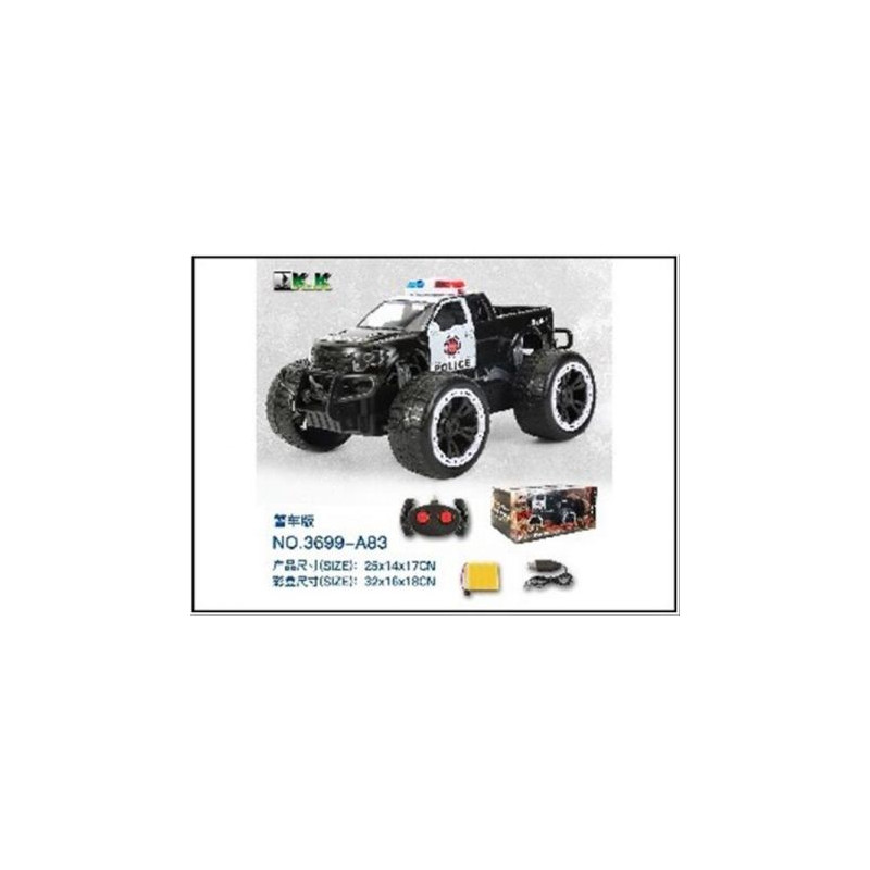 Policyjne, terenowe auto na sterowanie. Sylwetka pojazdu jest stylizowana na klasyczną terenówkę wielkimi kołami i elementami odwzorowującymi resory.