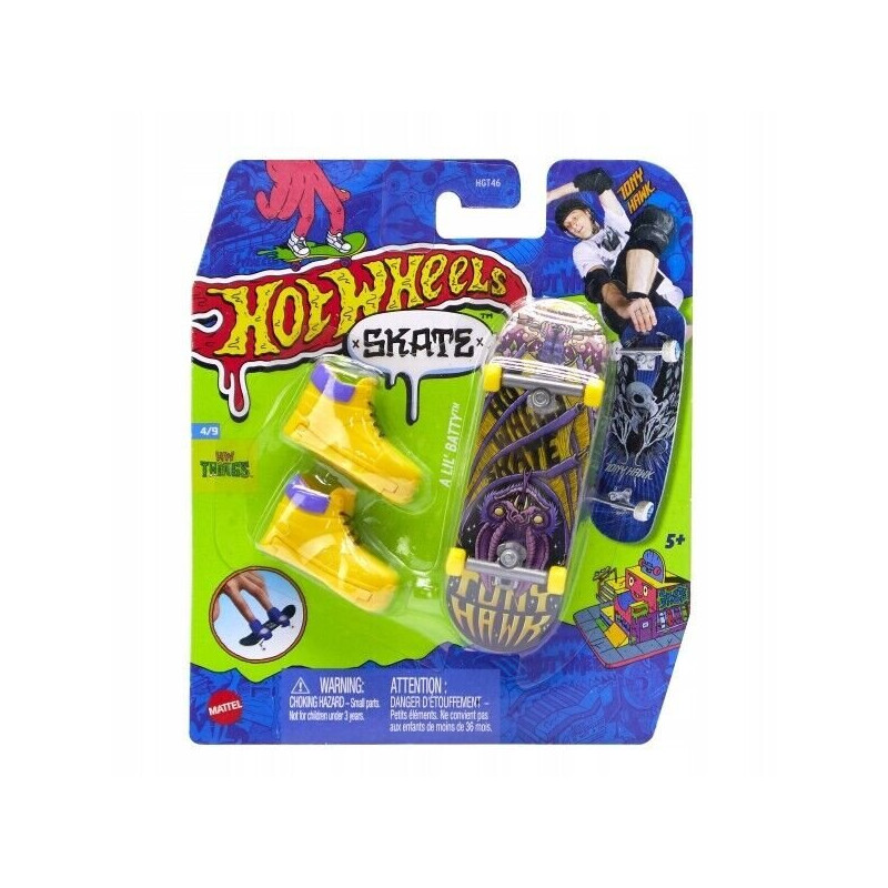 Hot Wheels i legenda skateboardingu, Tony Hawk, połączyli siły, aby stworzyć epicką kolekcję deskorolek do jazdy palcami doskonałą do ćwiczenia nowych sztuczek i niesamowitych tricków. W każdym zestawie jest deskorolka Hot Wheels do jazdy palcami oraz para stylowych zdejmowanych butów deskorolkowych, pomagających utrzymać palce na miejscu podczas rozgrzewających do czerwoności popisów. Nowicjusze mogą nabrać pewności siebie oraz lepiej wyczuć deskę i ruchy, a potem spróbować trudniejszych manewrów już bez butów na palce. Każda deska ma niepowtarzalny wzór, dzięki czemu fani będą chcieli zebrać je wszystkie. Sprzedawane oddzielnie w zależności od dostępności. Kolory i elementy dekoracyjne mogą się różnić.