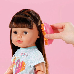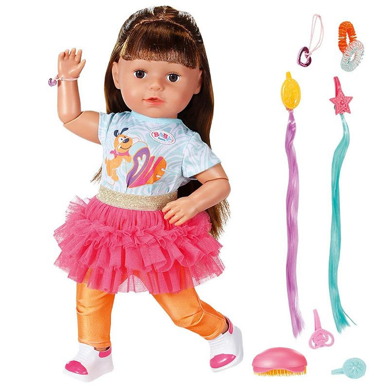 Siostrzyczka BABY born to całkiem nowa lalka o wyglądzie małej dziewczynki, o kilka lat już starszej od BABY born niemowlęcia. Siostrzyczka ma piękne długie brązowe włosy, które dziewczynki mogą czesać, wiązać i upinać dzięki dołączonej do zestawu wyjątkowej szczotce oraz akcesoriom do ozdabiania fryzur. Najnowsza wersja lalki została wzbogacona o kolorowe dopinane pasemka, które w niezwykły sposób ozdobią każdą fryzurę.