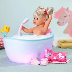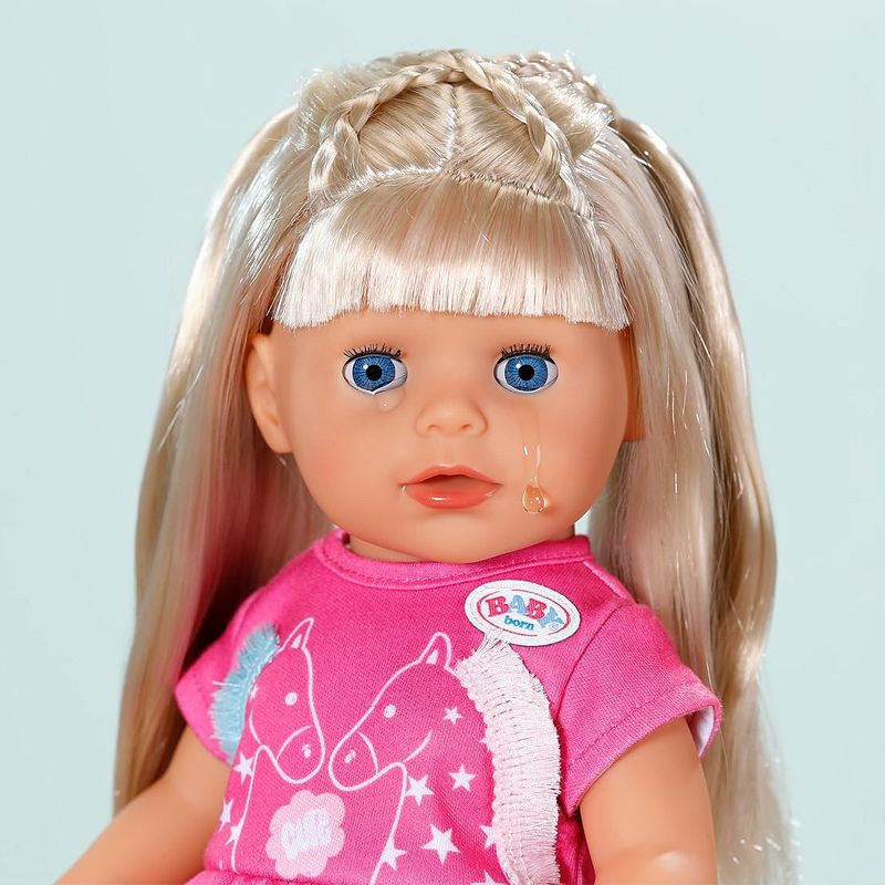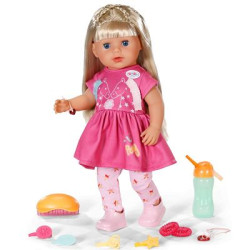 BABY born Siostrzyczka podobnie jak BABY born niemowlę pije z butelki i płacze prawdziwymi łzami. Laleczka ma nóżki zginane w kolanach, a jej stópki pozwalają jej stać samodzielnie. Dzięki temu że obie lalki mają taki sam wzrost mogą korzystać z wspólnej kolekcji ubranek.