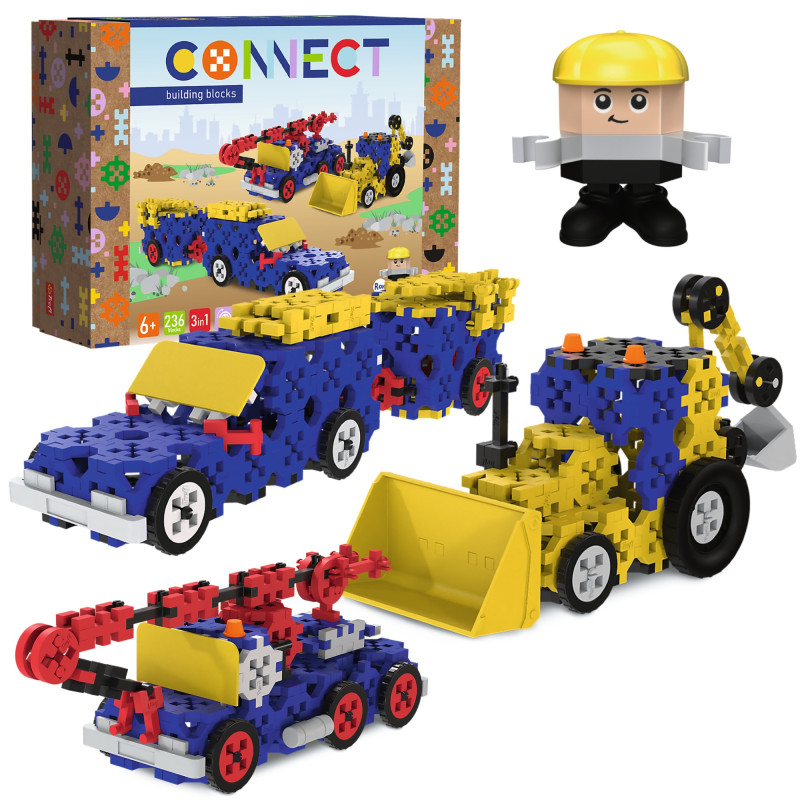 Zestaw konstrukcyjny 3w1: Construction Vehicles / SUV with Trailer pozwala zbudować trzy różne konstrukcje: buldożera i koparkę lub SUV-a z przyczepą. W zestawie znajdziesz 236 klocków, w tym dedykowaną figurkę o imieniu Ron, ruchome części i ozdoby - zbuduj z nich mobilne konstrukcje zgodnie z dołączoną instrukcją lub puść wodzę fantazji i daj upust kreatywności, realizując swoje pomysły. Poznaj serię Connect i zbuduj swój własny świat z klocków! Kolekcjonuj figurki i zamieniaj ich elementy, aby tworzyć jeszcze ciekawsze historie. Klocki Connect to wspaniała zabawa dla małych i dużych! Rozwijają kreatywność, uczą logicznego myślenia i rozwiązywania problemów. Pomagają zrozumieć zasady równowagi oraz symetrii, ćwiczą precyzję i umiejętności manualne.