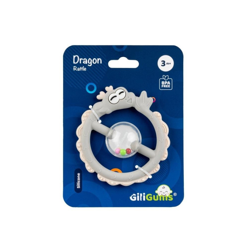 Smocza zabawka dla ząbkujących, łączy w sobie walory gryzaka i grzechotki! Całą powierzchnię obręczy zdobią zróżnicowane wypustki, które podczas gryzienia będą delikatnie masować dziąsła malucha. Dostosowany do małych rączek kształt zabawki, ułatwi maluchowi jej chwytanie. Wewnątrz smoka znajduje się kula wypełniona kolorowymi kuleczkami, które grzechoczą przy potrząsaniu.