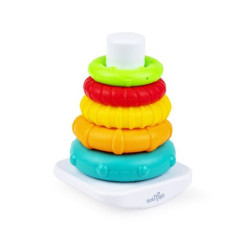 Zestaw zawiera pięć kolorowych obręczy o różnych rozmiarach. Maluch będzie układał z tych elementów super piramidkę. Zabawka zawiera podstawkę z drążkiem, która ułatwi budowanie od największego elementu do najmniejszego. Zróżnicowane faktury obręczy stymulować będą zmysł dotyku malucha, pozwalając mu przy tym rozwijać zdolności poznawcze.