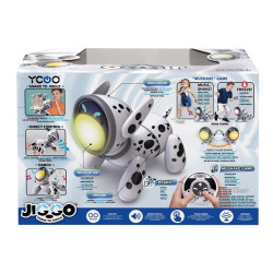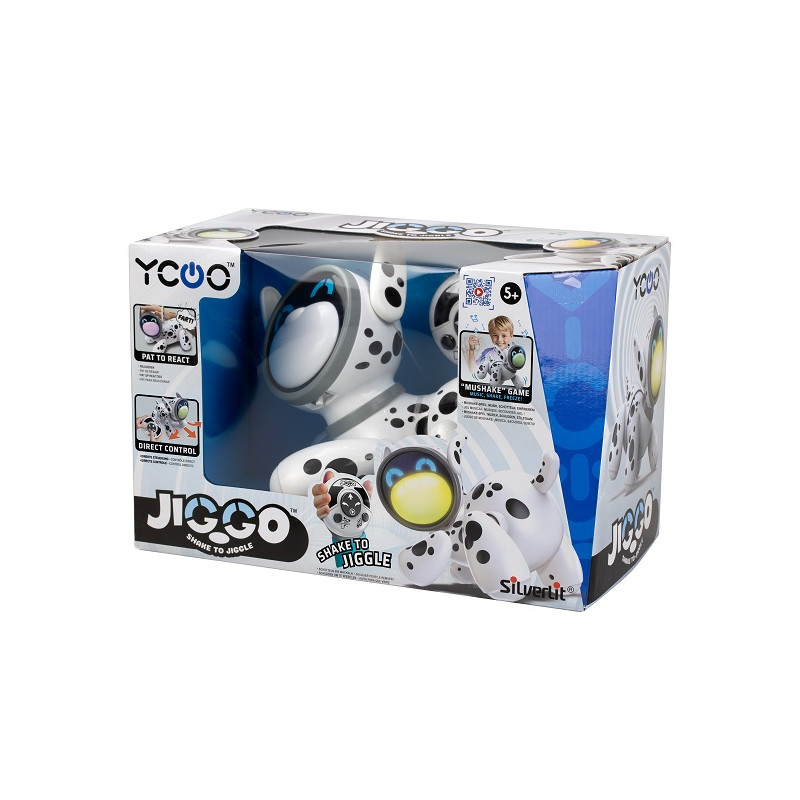 Jiggo to zdalnie sterowany robot na czterech łapkach! Ten uroczy psiak wyposażony został w ciekawe funkcje, które uatrakcyjnią zabawę. Poza standardowym poruszaniem się do przodu i na boki, piesek potrafi także tańczyć! Aby go do tego zachęcić, wystarczy, że rozsuniesz jego łapki i naciśniesz odpowiedni przycisk na pilocie. Jiggo bawi nie tylko popisami tanecznymi. Ten sprytny psiak zna grę, w którą możesz pobawić się razem z nim. Zabawka odtworzy melodię, a twoim zadaniem będzie potrząsać pilotem, a gdy dźwięk ucichnie, zatrzymać pilot. Jeśli zrobisz to za wcześnie lub zbyt późno - przegrasz, gdy trafisz w odpowiedni moment - wygrasz! Psi pyszczek świeci kolorowo, a główka pupila posiada czujnik dotyku, dzięki czemu Jiggo zareaguje, gdy go po niej pogłaszczesz.