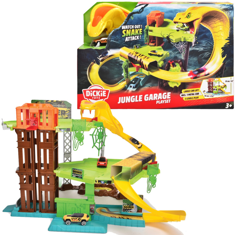 Zestaw składa się z toru samochodowego prowadzącego przez gigantycznego węża, który w każdej chwili może zaatakować przejeżdżające autko. Wykonany w przyjemnej, żywej kolorystyce z motywem dżungli z realistycznymi detalami takimi jak liany, drzewa i dekoracje. Tor samochodowy Dickie został wyposażony w wiele elementów urozmaicających zabawę. Zapewnia ekscytującą zabawę dla małych miłośników przygód. Tor posiada 3 poziomy, po których można jeździć dołączonym metalowym, pomarańczowym autkiem. Całość składa się z trzech poziomów, ruchomej windy przenoszącej autko między piętrami oraz zjazdów i podjazdów. Dzięki takiemu rozwiązaniu scenariusze zabaw nie mają końca!