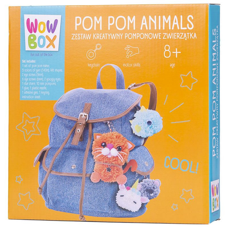 WOW BOX Zestaw kreatywny POMPONOWE ZWIERZĄTKA pozwala samodzielnie wykonać przeurocze, przesłodkie stworki z kolorowej włóczki. Te śliczne zwierzaczki będą genialnym breloczkami - codziennie możesz przypiąć do plecaka innego przyjaciela!
