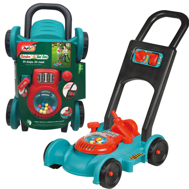 Kosiarka do trawy Kosiarka posiada rączkę, imitację startera silnika spalinowego, po pociągnięciu za rączkę słychać charakterystyczny dźwięk. Podczas popychania kosiarki, w koparce podskakują kolorowe kuleczki.