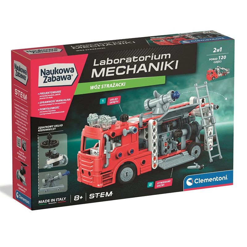Zestaw naukowy dla dzieci, który nauczy zasad działania maszyn ciężkich. 120 elementów pozwoli na eksperymentowanie, konstruując dwa modele pojazdów wykorzystywanych w ratownictwie lub transporcie. W skład modelu wchodzą koła zębate tworzące strażacki pojazd wyposażony w układ kierowniczy, pompę strażacką wyrzucającą „wodne bomby”, składaną drabinę ratowniczą, gaśnicę i wiele innych elementów.