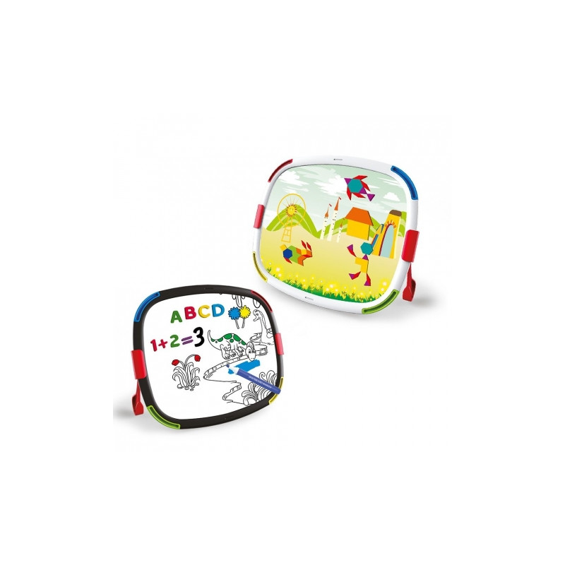 Edukacyjny zestaw dla dzieci od 3 roku życia, który łączy naukę z kreatywną zabawą. Jedna strona tablicy jest magnetyczna i umożliwia układanie kolorowych liter, cyfr oraz kształtów, natomiast druga przeznaczona jest do rysowania i pisania pisakami suchościeralnymi.