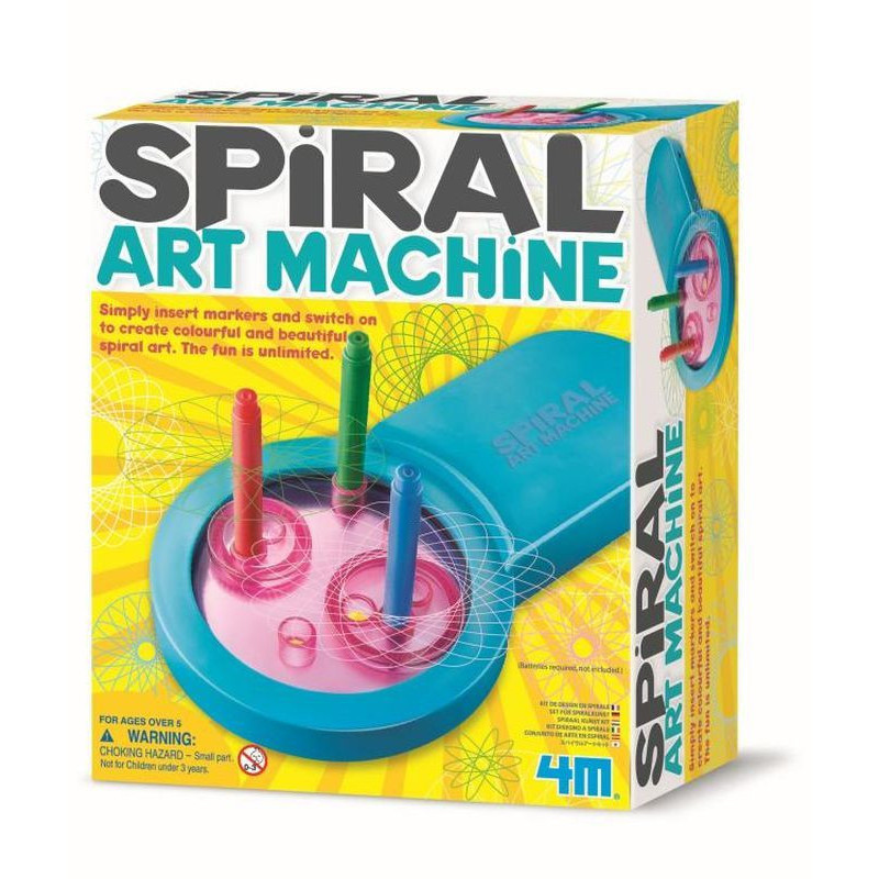Spiral Art Machine zestaw firmy 4M. Poznaj świat kształtów i kolorów, dzięki spirografowi rysuj niezwykłe wzory. Zestaw zawiera 3 elementy do złożenia spirografu, 3 flamastry, papier oraz szczegółową instrukcję.