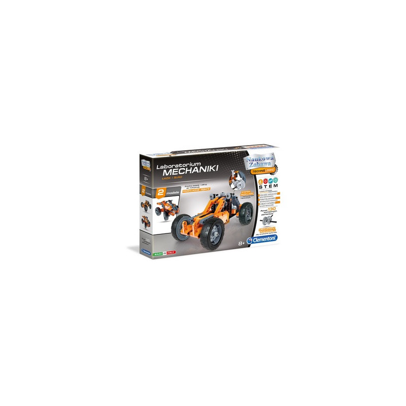 Laboratorium mechaniki Łazik i quad firmy Clementoni. Zestaw dydaktyczni dzięki któremu dzieci mogą poznawać zasady mechaniki i podstawy inżynierii. 130 elementów pozwoli na zbudowanie aż 2 modeli. Zestaw zawiera przekładnie oraz skrzynię biegów do zastosowania w modelach. Dodatkowo podręcznik w zestawie.
