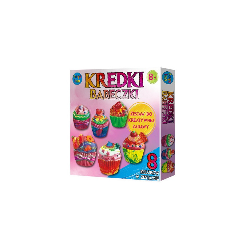 Kredki babeczki firmy Stnux. Zestaw do samodzielnego wykonania kredek świecowych. Zawiera granulat kredek w 8 kolorach, silikonową foremkę, łyżeczkę oraz instrukcję.