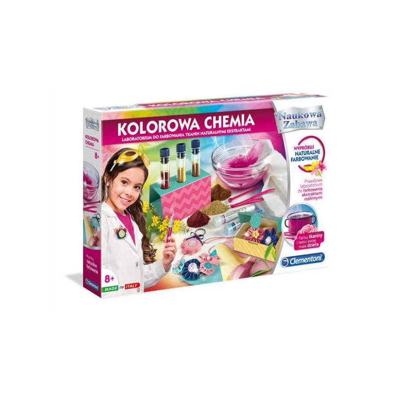 Kolorowa chemia firmy Clementoni. Naucz się barwienia na bazie naturalnych składników roślinnych. Zestaw zawiera ilustrowaną instrukcję dzięki, której wykonasz doświadczenia i poznasz tajniki techniki ekoprint. Wiek 8+
