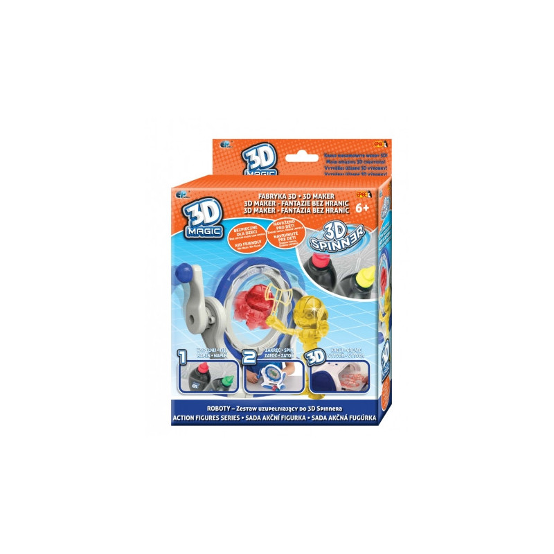 3D Magic Fabryka 3D Spinner kreuj w 3D firmy Epee. Stwórz własne, niepowtarzalne figurki 3D. Włóż projekt do lampy UV o poczekaj chwilkę, aż żel stwardnieje. Zestaw tematyczny ze spinnerem, którego formę trzeba uzupełnić żelem dla uzyskania figurki (wymagają użycia urządzenia 3D sprzedawanego osobno). Seria składa się z 3 różnych modeli. Cena dotyczy jednej sztuki. Zabawki wysyłamy losowo. Jeśli zależy Ci na konkretnym modelu zaznacz to w zamówieniu. Wiek 6+