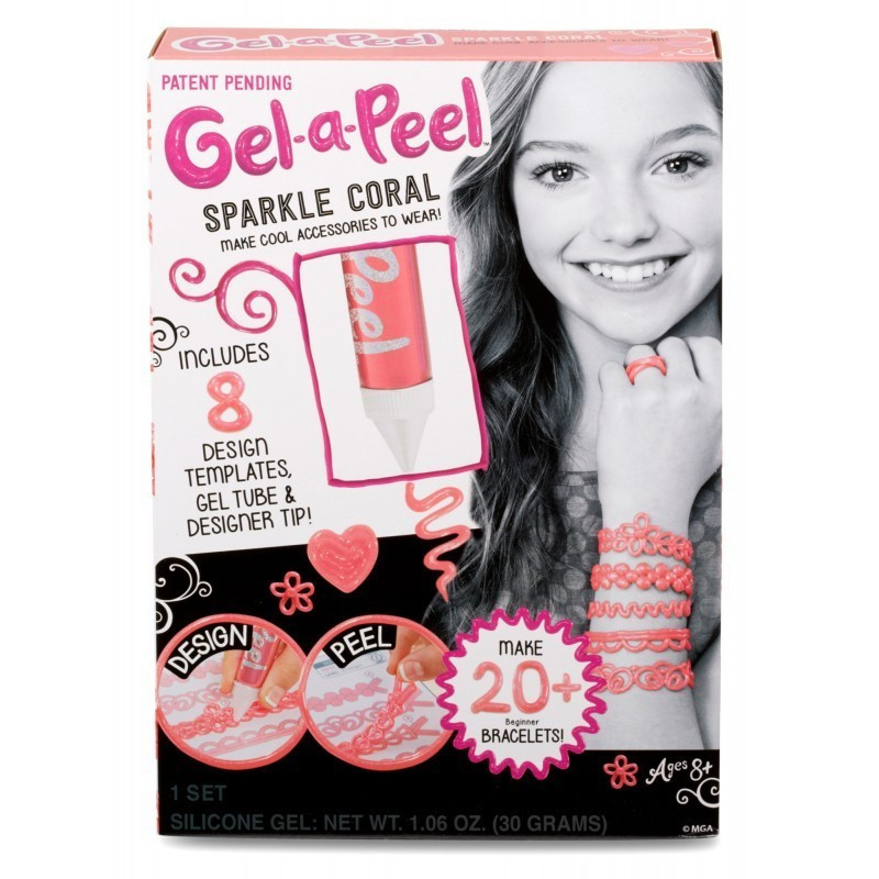 Gel A Peel Zestaw startowy firmy MGA. Stwórz własną kolorową biżuterię dzięki niezwykłemu żelowi. Zestaw zawiera 8 szablonów z projektami, przezroczystą plansze do projektowania, 1 tubkę żelu, szpatułkę i narzędzie do czyszczenia. Wiek 8+