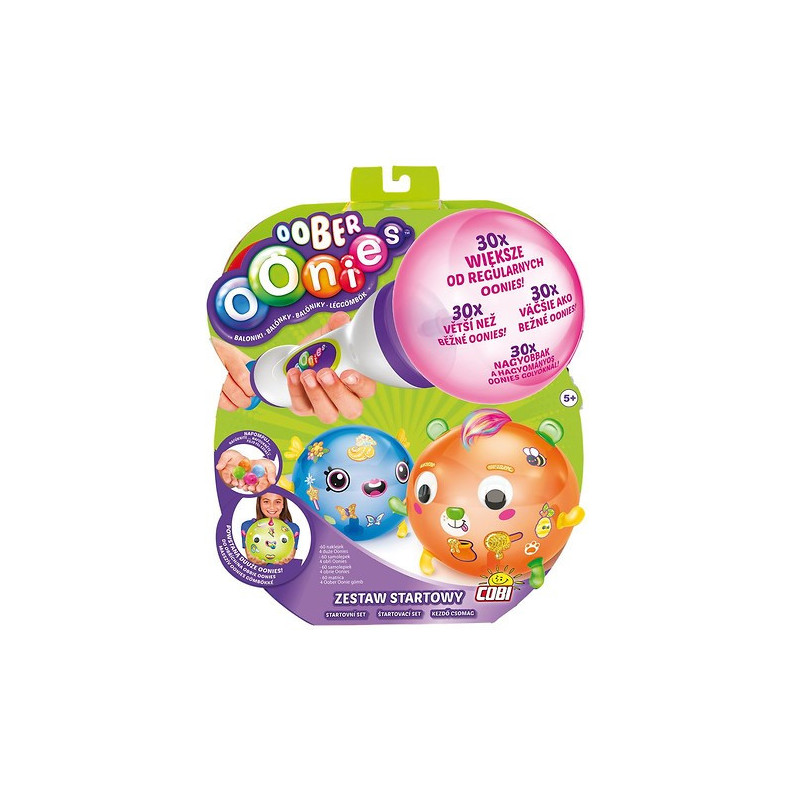 Zestaw startowy Oonies Oober firmy Cobi. Zestaw, startowy do zabawy z Oonies. Stwórz mnóstwo figurek 30 razy większych od zwykłych Oonies. Zestaw zawiera pompkę, 4 duże Oonies + jedne zapasowy, 4 oczy, 4 kosmyki włosów, arkusz brokatowych naklejek, zwykłe naklejki, 24 akcesoria, podstawkę i instrukcję. Wiek 5+