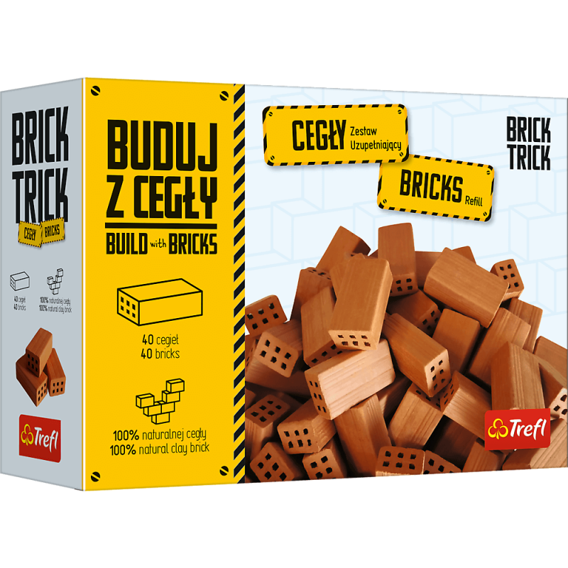 Brick Trick Refil Cegły całe 40 sztuk firmy Trefl. Zostań konstruktorem i wykorzystuj prawdziwe cegły i drewno. Wykorzystaj dołączone plany budowy lub wymyśl coś samodzielnie. Rozpuść konstrukcję i buduj od nowa. Zestaw zawiera mnóstwo elementów do kreatywnej zabawy. Wiek 6+ Ostrzeżenie:Nieodpowiednie dla dzieci w wieku poniżej 36 miesięcy. Małe części.