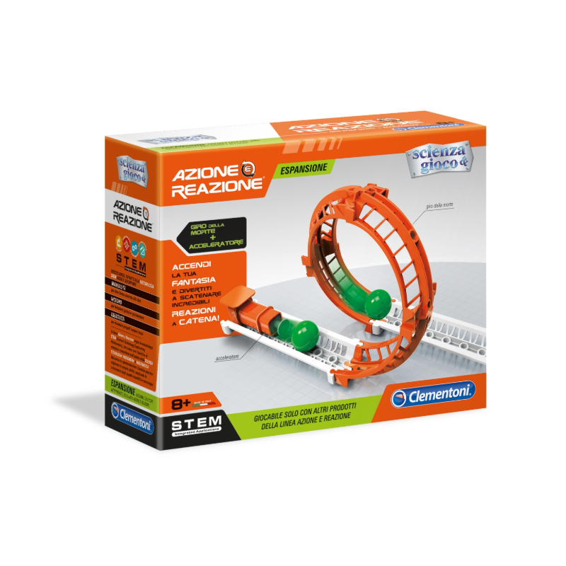 Akcja Reakcja Pętla firmy Clementoni. Zestaw kompatybilny z serią Akcja Reakcja. Dzięki niemu można tworzyć jeszcze bardziej widowiskowe tory. Buduj i rozwijaj swoją wyobraźnię. Wiek 8+