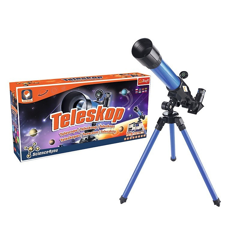 Teleskop firmy Trefl. Teleskop z serii Science4You dzięki któremu dowiesz się ile znajduje się gwiazd w układzie słonecznym, które z nich możesz zobaczyć z Ziemi oraz jaka planeta jest największa. W zestawie z bogato ilustrowanym podręcznikiem. Wiek 8+