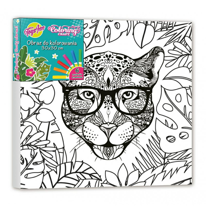 Obraz do kolorowania Pantera z brokatem zawiera podobrazie o wym, 30 x 30 cm oraz zestaw 6 markerów. Obraz przedstawia panterę w okularach do pomalowania. Podobrazie wykończone jest elementami brokatowymi, które także można pomalować. W zestawie znajduje się 6 markerów o kolorach: czerwony, pomarańczowy, żółty, zielony, niebieski i różowy.