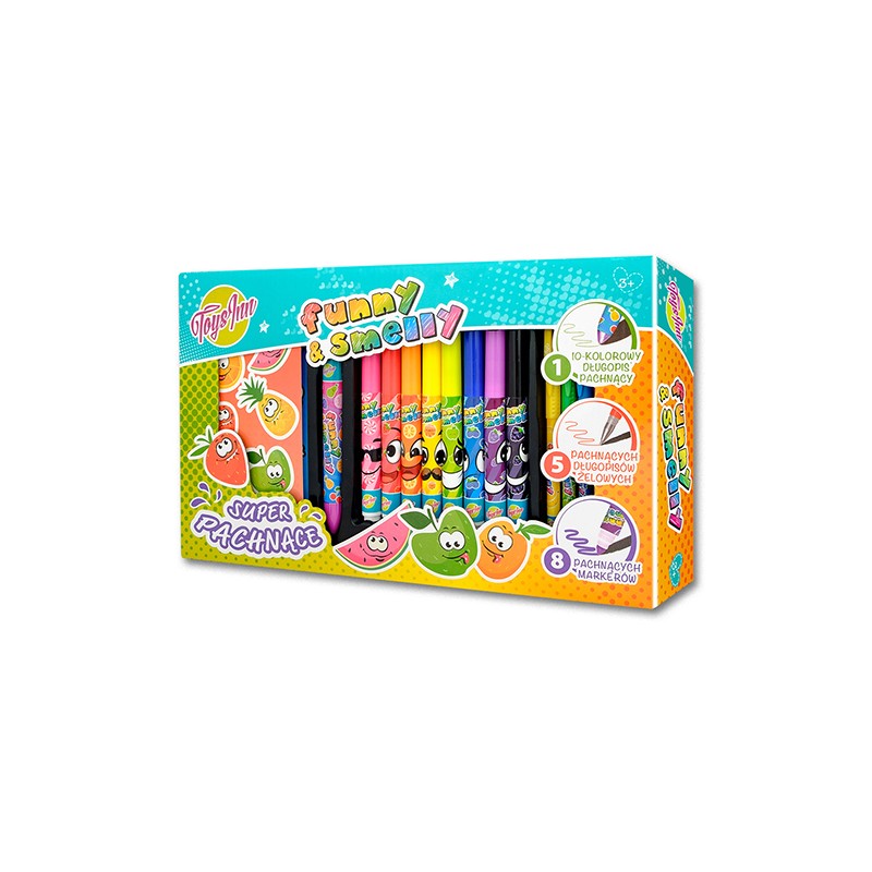 Zestaw pachnący do kolorowania, a w nim jeden 10-kolorowy długopis pachnący, 2 arkusze pachnących naklejek, 5 pachnących długopisów żelowych oraz 8 pachnących markerów. Długopisy żelowe pachną: żółty (banan), zielony (jabłko), niebieski (jagoda), różowy (arbuz) i czerwony (truskawka). Zapachy markerów: różowy (landrynka), czerwony (truskawka), pomarańczowy (pomarańcza), żółty (krówka mleczna), zielony (jabłko), niebieski (jagoda), fioletowy (winogrona), czarny (jeżyna).
