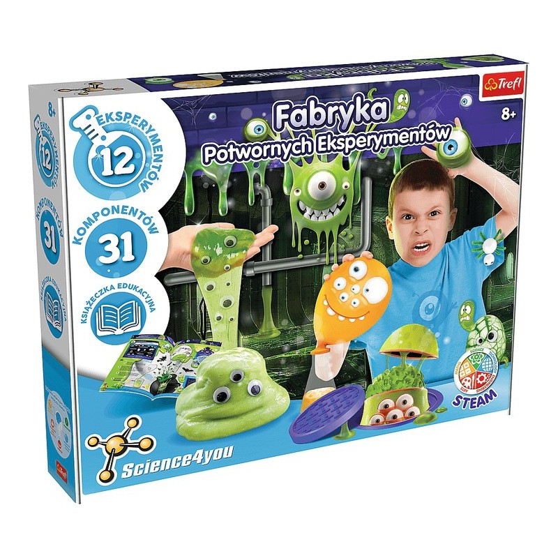 Do wykonania 12 eksperymentów. Dzięki temu zestawowi dowiesz się, czym są potwory i skąd pochodzą pierwsze wzmianki o nich, zdobędziesz wiedzę na temat różnorodnych mutacji, które mogą występować u ludzi. Poznaj pojęcie nauki, przeczytaj wiele potwornych faktów. Wykonaj mnóstwo ciekawych eksperymentów: klejący potwór, oko cyklopa a może smocze jajo.