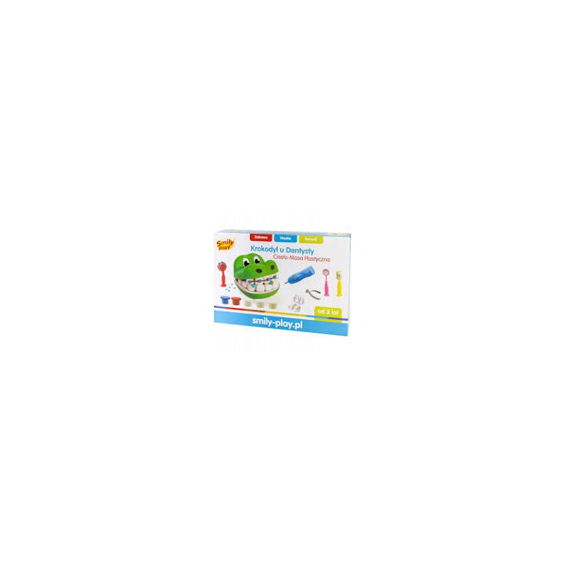 W zestawie: 5 x pojemnik z ciasto-masą 50 g, 1 x głowa krokodyla, 1 x foremka, 4 x przybory dentystyczne,