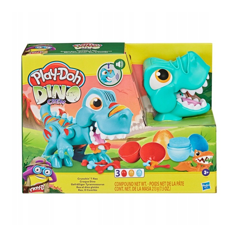 Czas na dino-obiad, a ten T-Rex jest gotowy do przeżuwania. Przygotuj dla niego smakowite kąski z ciastoliny Play-Doh i zobacz, jak wpadają wprost do jego przezroczystego brzuszka. Kiedy skończy "trawić", zrobi ciastolinową kupę w akompaniamencie przezabawnych dźwięków. Nie martw się o bałagan, bo jego przyjaciel Pterodaktyl w mig wszystko uprzątnie i uformuje ciastolinę w jajka. Ciastolina w zestawie znajduje się w tubach w kształcie jaj. Baterie: 2x LR44 (w zestawie). Super zabawa gwarantowana.