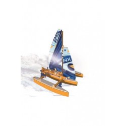 Model główny, trimaran, jest wyposażony w regulowany ster i żagle.