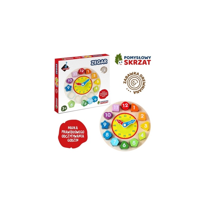 Zegar ASKATO z serii Pomysłowy skrzat to wspaniały sposób na naukę godzin oraz odczytywanie ich właśnie z zegara.