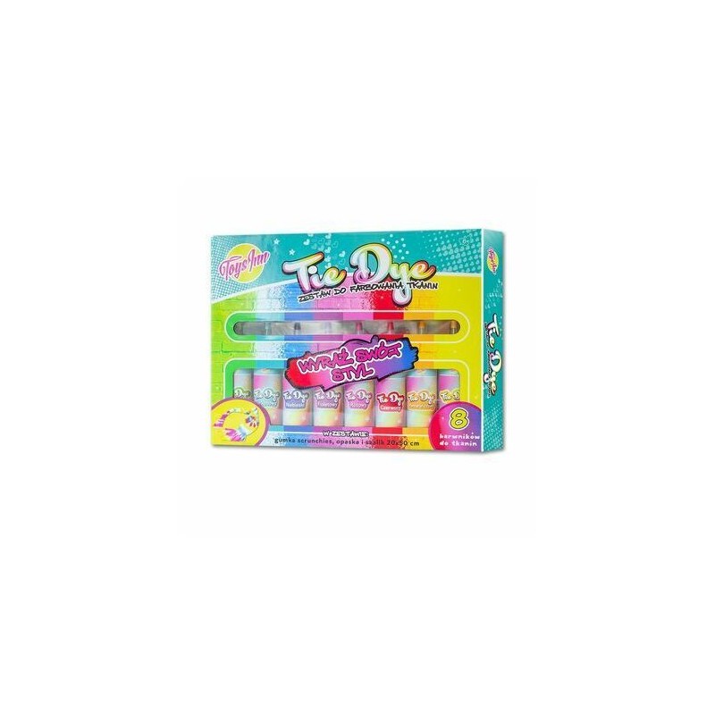 W skład zestawu wchodzi 8 butelek z barwnikiem do tkanin po 5.2 g (żółty, pomarańczowy, czerwony, różowy, fioletowy, niebieski, turkusowy i zielony), bawełnianą, białą apaszkę 20x50 cm, opaskę na włosy, gumkę scrunchies, 3 pary rękawiczek, obrus 91x91 cm, 30 szt. gumeczek, instrukcję.