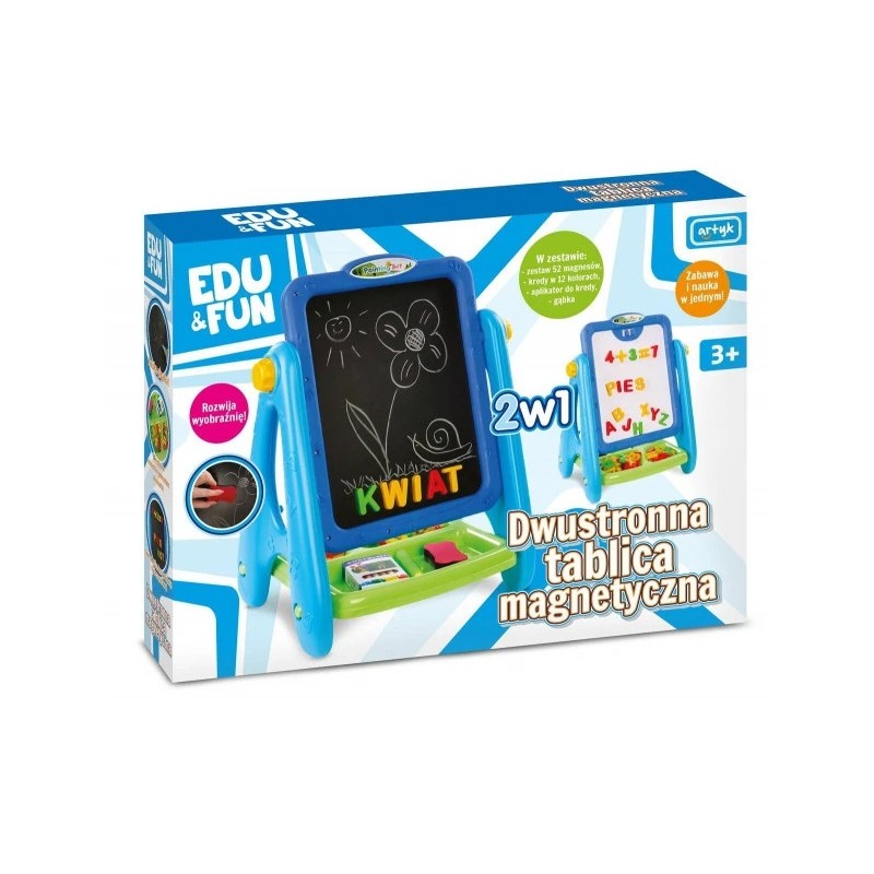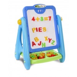 Tablica do rysowania to połączenie dwóch funkcji - super zabawy i nauki. Tablice pozwalają rozwinąć umysł, zmysł estetyczny, umiejętności plastyczne oraz manualne dziecka. Tablica w formie sztalugi. Z jednej strony tradycyjna tablica po której można pisać kredą, a po drugiej biała tablica, po której piszemy mazakami. Obie strony są magnetyczne.