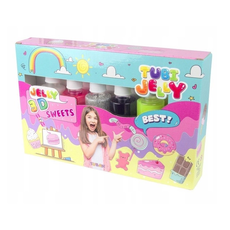Zestaw tubi jelly słodycze zawiera: 6 żelowych płynów o pojemności 150 ml: różowy, biały, fioletowy, turkusowy, żółty, brokatowy srebrny, 9 szablonów z wzorami słodyczy, 1 czystą folijkę; 3 saszetki z aktywatorem 5 g; miskę.