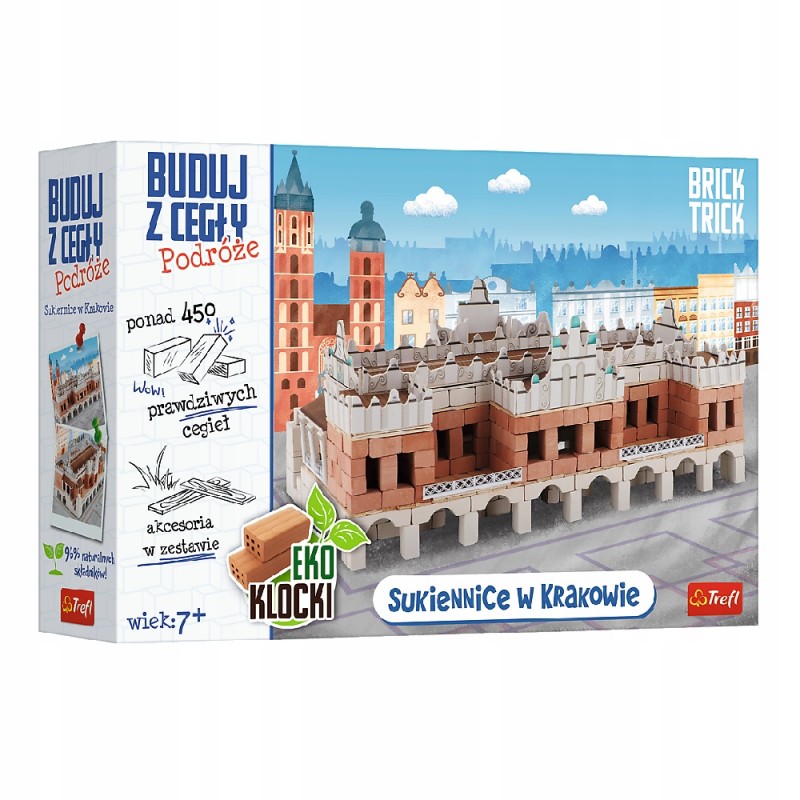 Sukiennice to konstrukcja z serii Brick Trick Podróże, której replikę zbudujesz z prawdziwych cegieł i dodatkowych elementów ozdobnych. Murowanie przy użyciu prawie pół tysiąca cegieł z typowymi dla tego budynku nadprożami łukowymi jeszcze nigdy nie było tak pasjonujące. Zestaw zawiera ponadto aż 5 metrów deseczek drewnianych i tekturowe grafiki dachu, które gwarantują jeszcze więcej zabawy. Zbudowane z białych i czerwonych cegieł Sukiennice mają ponad 30 cm długości i z pewnością będą dumą każdego młodego budowniczego. Rozpuść konstrukcje w wodzie i buduj od nowa.