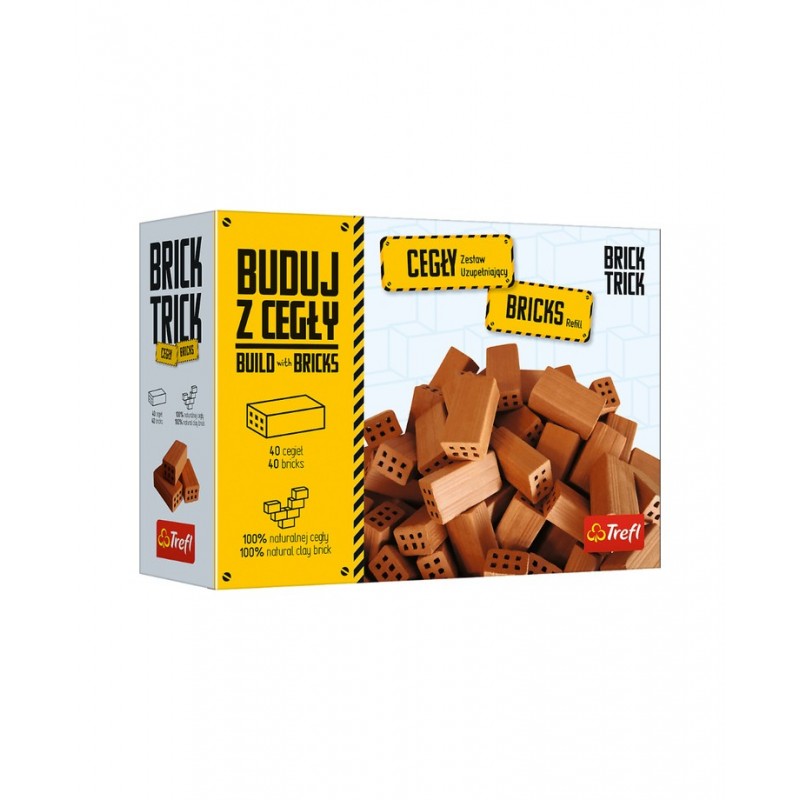 Zestaw uzupełniający cegły pełne 40 szt pochodzi z serii Brick Trick, umożliwia budowanie modeli budynków przy użyciu prawdziwych cegiełek, drewna, specjalnego kleju i elementów dekoracyjnych. Konstrukcję można rozpuścić w wodzie i zacząć zabawę od nowa. Wiek 6+.