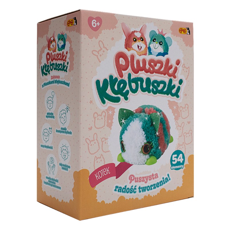 Pluszki-Kłębuszki to urocze pluszaki do samodzielnego zrobienia. Twórz, stylizuj je i baw się kolorami. Zabawa polega na przyklejaniu odpowiedniej porcji włóczki na korpus Pluszka-Kłębuszka, łącznie można stworzyć aż 12 różnych wzorów.