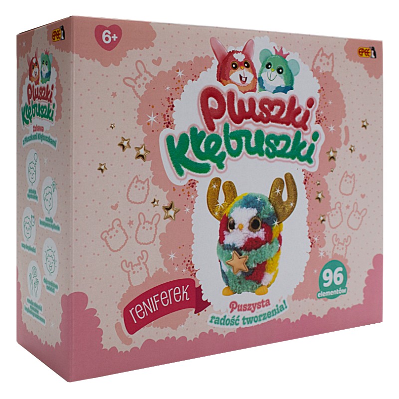 Pluszki-Kłębuszki to urocze pluszaki do samodzielnego zrobienia. Twórz, stylizuj je i baw się kolorami. Zabawa polega na przyklejaniu odpowiedniej porcji włóczki na korpus Pluszka-Kłębuszka, łącznie można stworzyć aż 12 różnych wzorów.