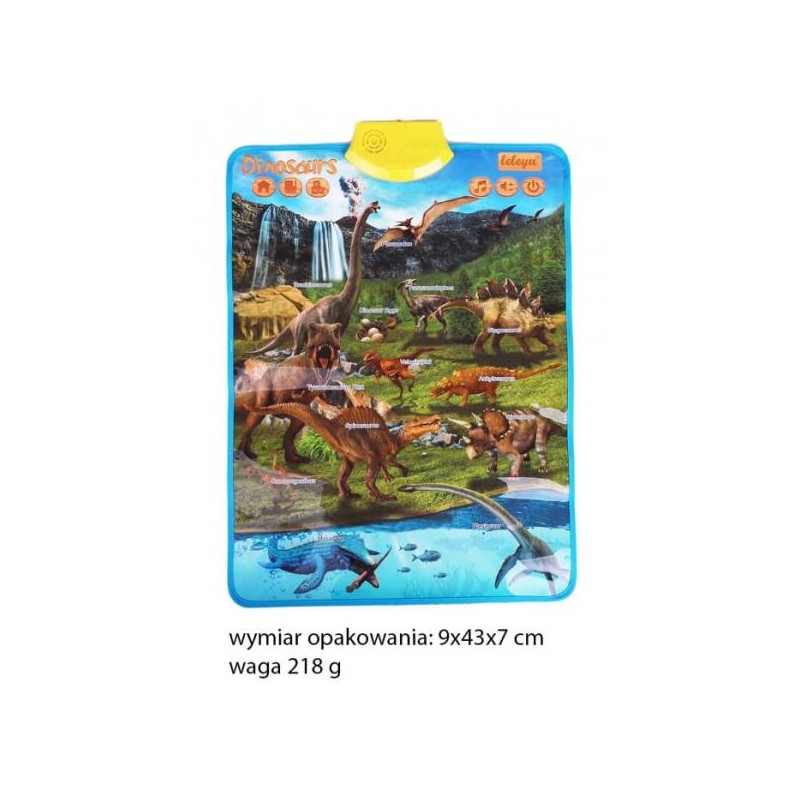 Mówiący plakat z dinozaurami, ciekawostkami, quizami i grami, piosenkami. Wykonana jest w barwnych kolorach i ciekawej grafice. Poznaj z nią zabawne fakty dotyczące każdego dinozaura. W trybie quizu spróbuj znaleźć odpowiedniego, aby odpowiedzieć na pytanie. Mata wymaga 3 baterii AAA (nie dołączono do zestawu). Wersja: angielska Wymiary maty: 41x55,5cm. Wiek: 3+.