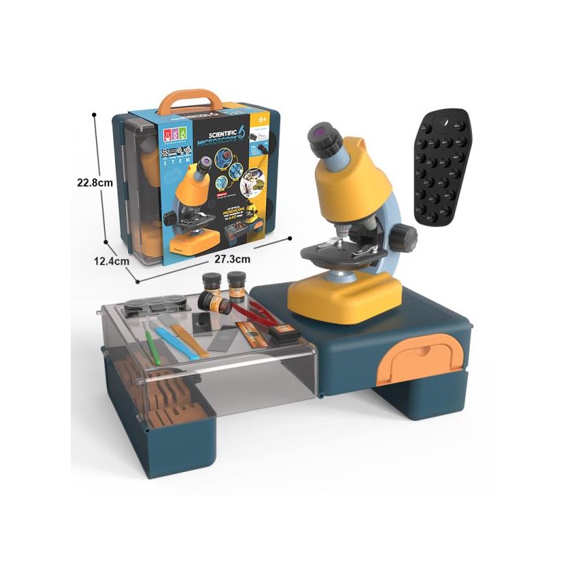 Stanowisko z mikroskopem powiększającym do 1200 razy i akcesoriami. W solidnej, rozkładanej walizeczce z rączką znajdziemy: narzędzia do nakładania próbek, specjalne szkiełka i pojemniki na próbki. Przez mikroskop optyczny obejrzymy w przybliżeniu wnętrze warzyw, liści, insektów i wielu innych obiektów organicznych. Sprzęt pozwala na dostosowanie ostrości. Stanowisko do obserwacji mikroświata jest produktem, który odznacza się wysoką jakością. Dzięki temu, że zostało wyposażone w antypoślizgowe stópki, mamy pewność, że mikroskop jest bezpieczny. Bateria: 2xAA (brak w zestawie). Wiek: 6+.