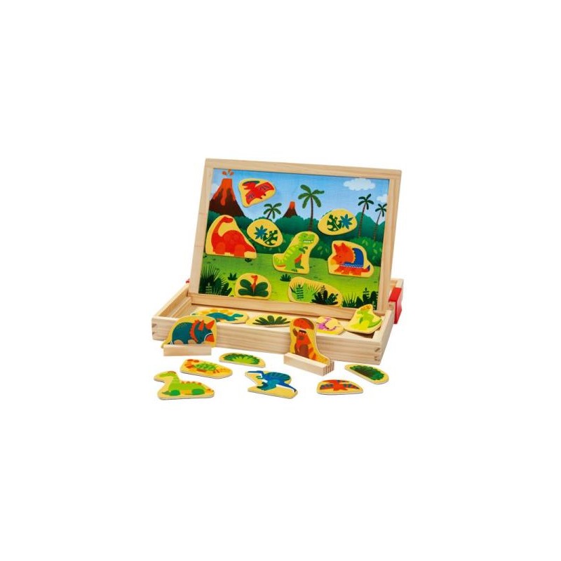 Magnetyczna tablica (układanka) z drewnianymi plakietkami odwzorowującymi dinozaury i inne elementy pierwotnej scenerii. Dzięki temu, że możemy rozmieścić dinozaury w różnym miejscu na tablicy z grafiką, istnieje możliwość odgrywania różnych scenariuszy. Po drugiej stronie zabawki znajduje się tablica ze scenerią, którą możemy pokolorować (przy pomocy dołączonego markera suchościeralnego). Zawartość: