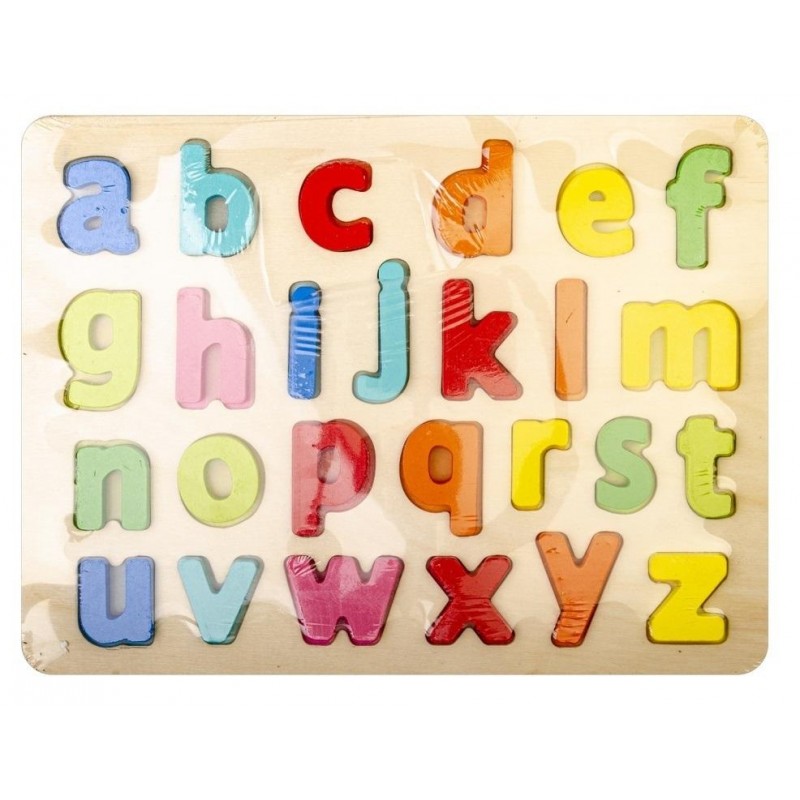 Układanka drewniana dla dzieci, rozwija spostrzegawczość, wyobraźnię i koordynację wzrokowo-ruchową. Puzzle z uchwytami uławiającymi ich przenoszenie. Układanka edukacyjna, pomaga w nauce liter.