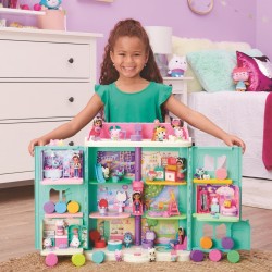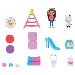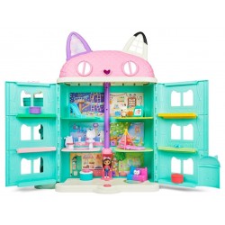 Domek Gabi jest wysokim, fantastycznym miejscem zabaw dla wszystkich twoich figurek z serii "Koci Domek Gabi". Dom jest pełen ekscytujących funkcji, a liczne mebelki pozwalają dziecku udekorować tę śliczną przestrzeń po swojemu. Ustaw figurkę Gabi w kociej windzie, by dziewczynka mogła zerknąć, co robią jej podopieczni w swoich pokoikach. Śpiewają w pokoju muzycznym, a może gotują w kuchni. Naciśnij przycisk, aby usłyszeć melodie i dźwięki z bajki! Tak jak w serialu, wrzuć specjalny pakunek do tuby, by pudełko z niespodzianką wylądowało na parterze. Rozpakuj wnętrze opakowania i odkryj magiczne kocie gadżety.