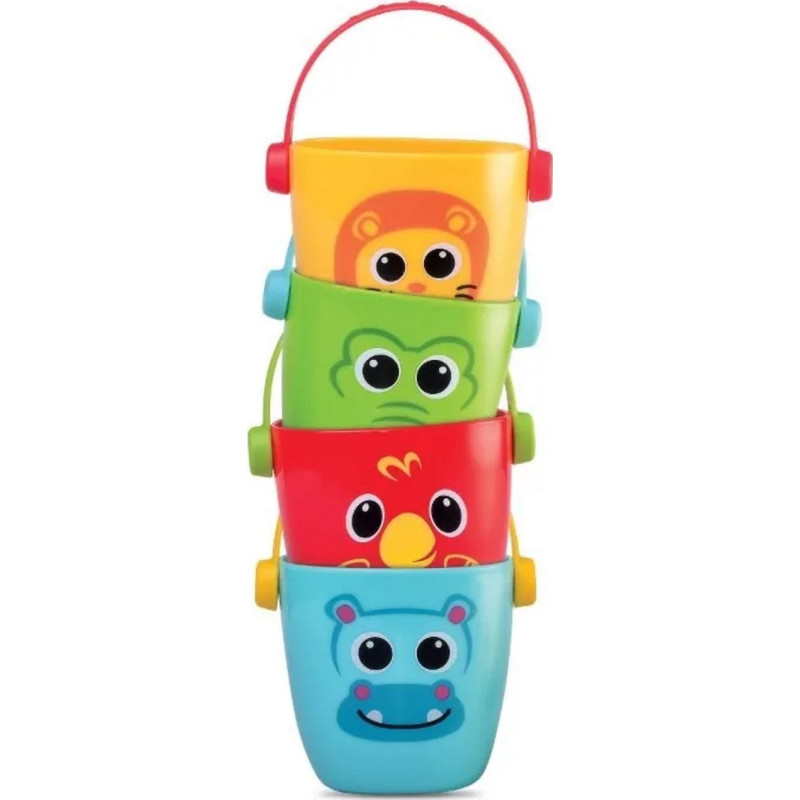 Zestaw zawiera, cztery kolorowe wiaderka, każde z nich zdobi inny obrazek z cyferką, a dodatkowo, posiadają one zróżnicowane otwory na spodzie. Dzięki temu, kiedy napełnimy wiaderko wodą, każde z nich będzie ją przelewało w inny sposób! Wiaderka można składać jedno w drugie, co ułatwia ich przechowywanie.