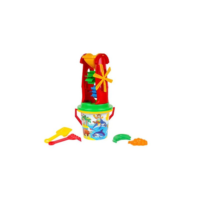 Wiaderko z młynkiem i akcesoriami, wykonane z bardzo dobrej jakości materiału, posiada kolorową grafikę ze zwierzątkami. Wsyp piasek i zobacz jak obrotowe wirniki przesiewają go.