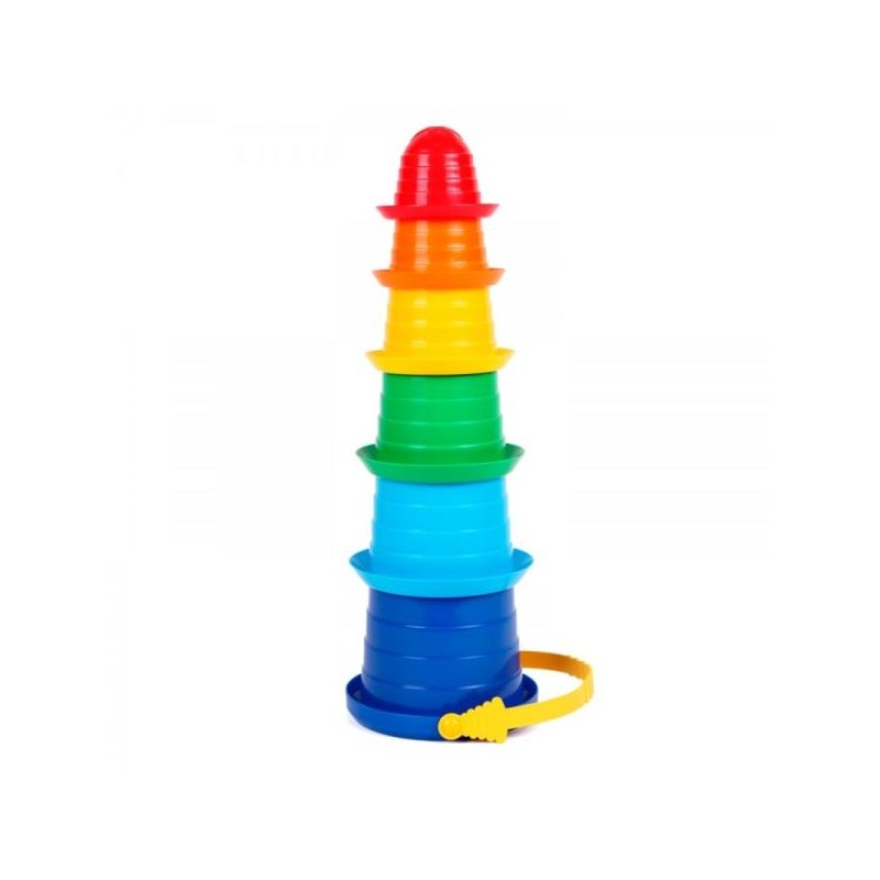 Wiaderko i zestaw foremek ułożony w piramidkę. Każda z foremek (5x) posiada inny rozmiar oraz kolor. Kształt jest taki sam - nawiązuje do kapelusza Sombrero. Na podstawie niektórych foremek znajdują się małe otwory, które ułatwiają przepływ wody. W zestawie znajduje się również wiaderko z ruchomą, wygodną rączką. Odpowiednio wyprofilowana rękojeść zapewnia komfort użytkowania. Zestaw przydaje się do zabawy na plaży, na podwórku i nad jeziorem.