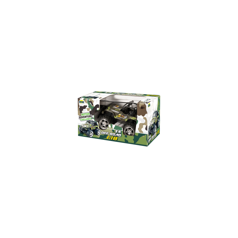 Samochód Jeep zdalnie sterowany firmy Dromader. Samochód Buggy sterowany na radio. Sterowany na częstotliwości 27 Mhz, pełen zakres ruchu oraz efekty świetlne. W zestawie ładowarka i akumulator, do zestawu nie dołączono baterii, wymagane 2 x AA. Skala 1:18 Wiek 6+