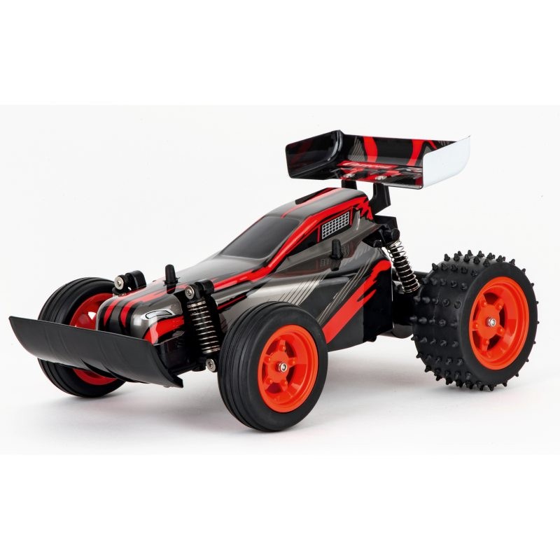 Pojazd Buggy RC koloru czarnego z czerwonymi elementami sprawi, że młody kierowca zamieni się w króla wyścigów. Gumowe koła pneumatyczne z resorami pozwalają na zabawę nie tylko w domu, ale również na zewnątrz oraz pokonywanie różnorodnych przeszkód.