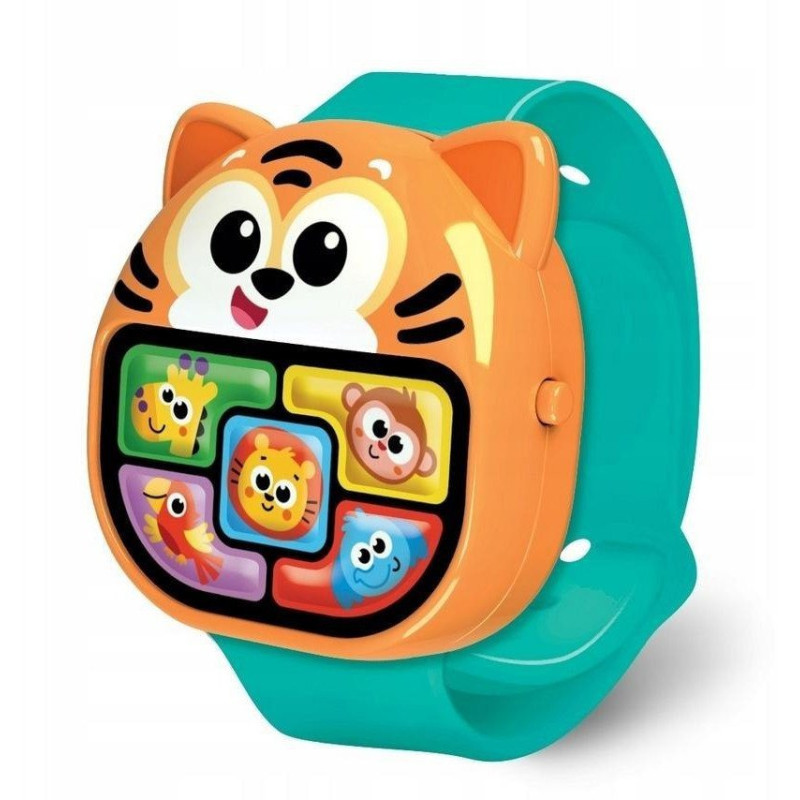Kompaktowy zegarek malucha, towarzysz zabawy, uroczy tygrysek, który zamiast godzin, nauczy powitań dostosowanych do pory dnia! Zabawka wypowiada także inne, wesołe zwroty, odtwarza pięć różnych piosenek w języku polskim. Tygrysek wyposażony został w praktyczny, regulowany pasek do zapięcia na rączce oraz guziczek, znajdujący się z boku, który umożliwia wyłączenie zabawki.