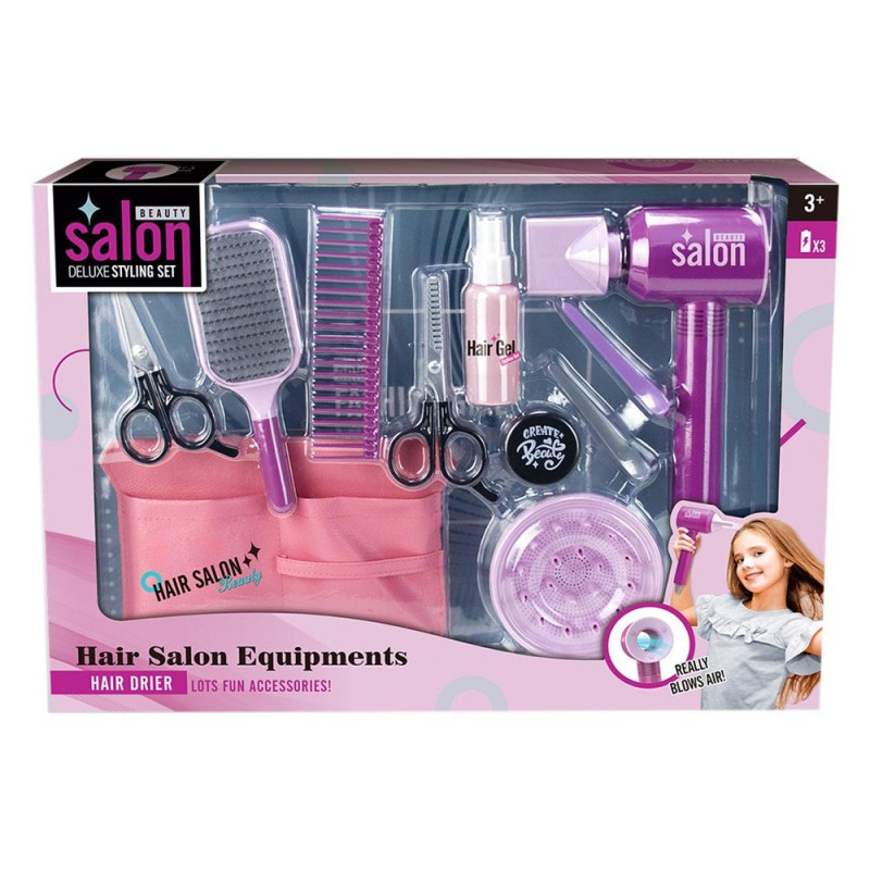 Duży zestaw fryzjerski składający się z wielu elementów: suszarki z dwoma wymiennymi końcówkami, szczotki, torebki na drobiazgi przyczepianej w pasie, dwóch par nożyczek, grzebienia, dwóch spinek, plastikowej buteleczki. Suszarka wymaga baterii: 3xAAA (niedołączone)