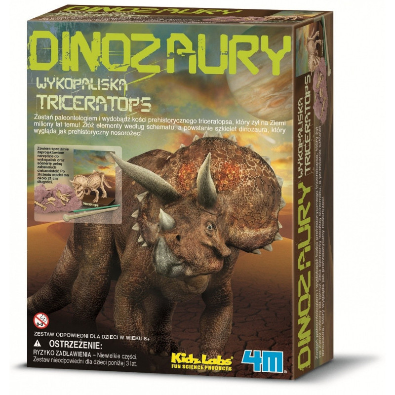 Zostań paleontologiem i wydobądź kości prehistorycznego triceratopsa, który żył na ziemi przed tysiącami lat. Złóż kości według schematu. Zestaw zawiera bryłę gipsu w której ukryte są kości dinozaura oraz narzędzia do prowadzenia wykopalisk. Po odnalezieniu i oczyszczeniu wszystkich kości można z nich złożyć cały szkielet. Gotowy szkielet ma około 20 cm długości. Dołączona do zestawu kartonowa karta ekspozycyjna zawiera wiele ciekawych informacji na temat Triceratopsa na odwrocie.